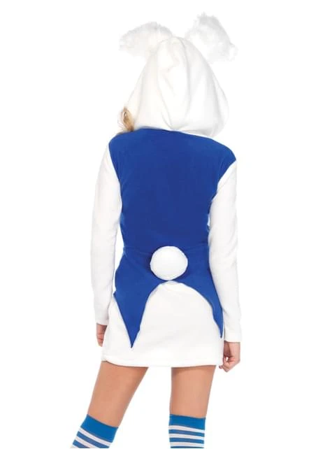 Incluye vestido de felpa con cremallera frontal capuchón con orejas y cola, pajarita de lunares y reloj de bolsillo.