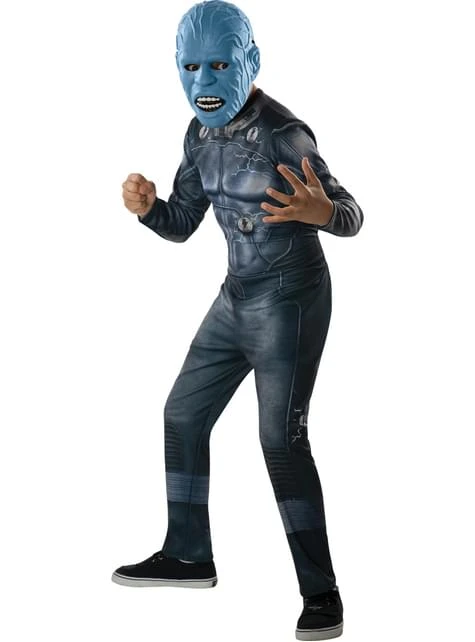 Este temible disfraz de Electro incluye un mono gris con detalles oscuros y plateados, y una máscara azul con el rostro del personaje.