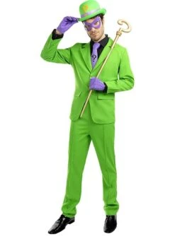 Este enigmático disfraz de Riddler incluye una chaqueta verde, color por el que se identifica a este villano, unido a una camisa negra y a una corbata verde con signos de interrogación negros estampados. Incorpora un sombrero a juego con la corbata, del mismo color y estampado y un antifaz negro para proteger la identidad.
