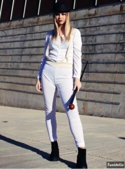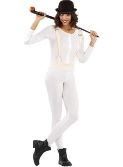 Y ahora tu podrás convertirte en el mismĂsimo Alex DeLarge con este traje de la Naranja Mecánica para mujer: compuesto por un mono blanco de cuerpo entero y tirantes.