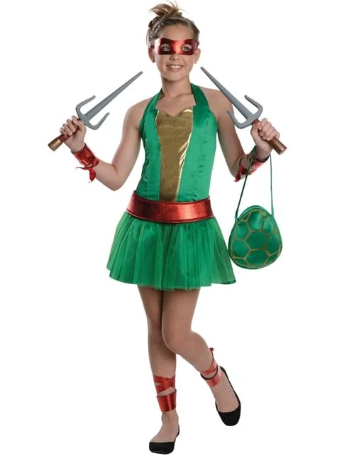 Incluye: vestido, bolso con forma de caparazón, muñequeras, espinilleras y antifaz