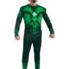 Incluye un mono alienígena verdoso y negro con pecho musculado en el que incorpora el logotipo de Green Lantern, cubrebotas, anillo no luminoso y una máscara que refleja a la perfección su look extraterrestre de tipo anfibio