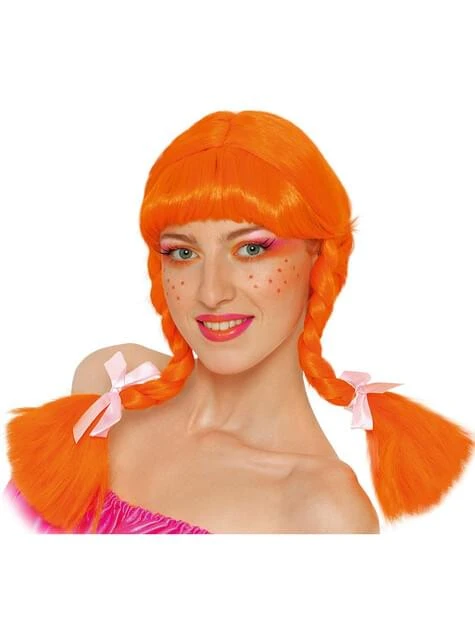 Incluye una peluca naranja con flequillo y dos trenzas a los lados.